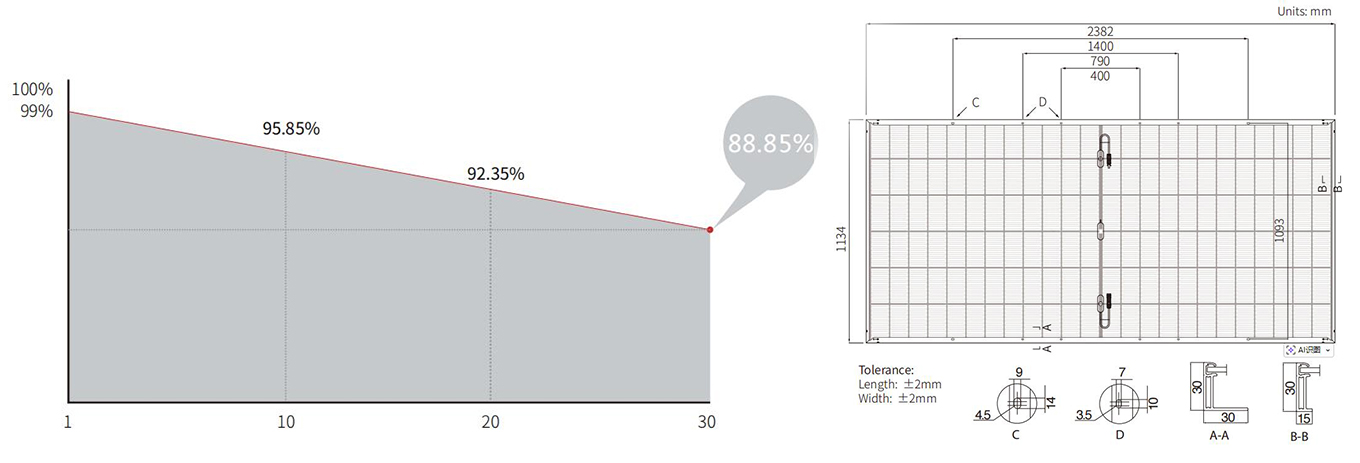 STC: AM1.5 1000W/m² 25°C NOCT: AM1.5 800W/m² 20°C 1m/s عدم اليقين في الاختبار لـ Pmax: ±3%