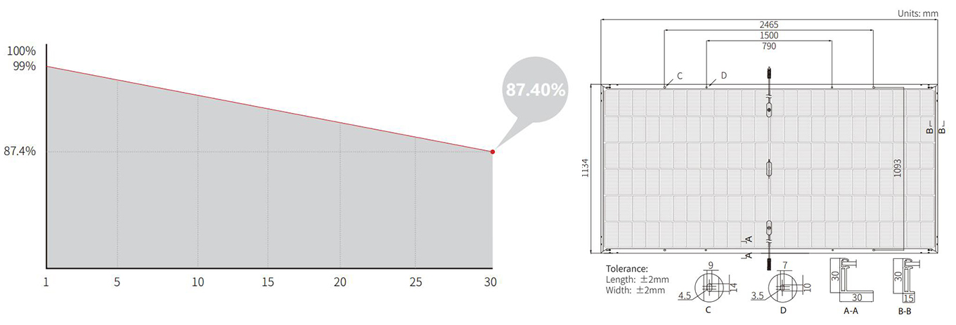 ▶ توفر ثنائية الوجه العالية ومعامل درجة حرارة الطاقة الممتاز مكاسب كبيرة في إنتاج الطاقة.